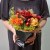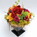 周りを取り巻くオレンジ、黄、濃ピンク色・・・と暖色系の花たちのおしゃべりが聞こえてきそうな賑やかなアレンジです。